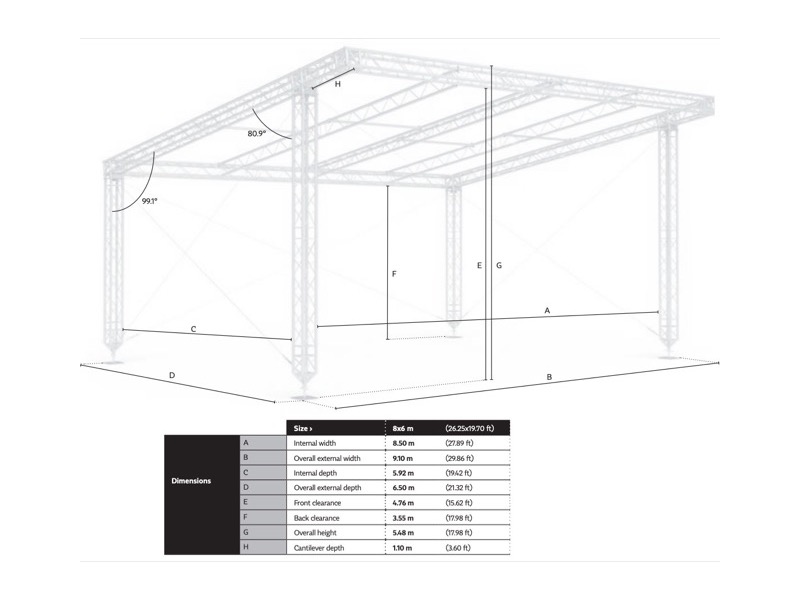 Chapiteau MR0 avec avancée 8 x 6 m hauteur 4,7 m avec bâche de toit gris argenté - QUICKTRUSS